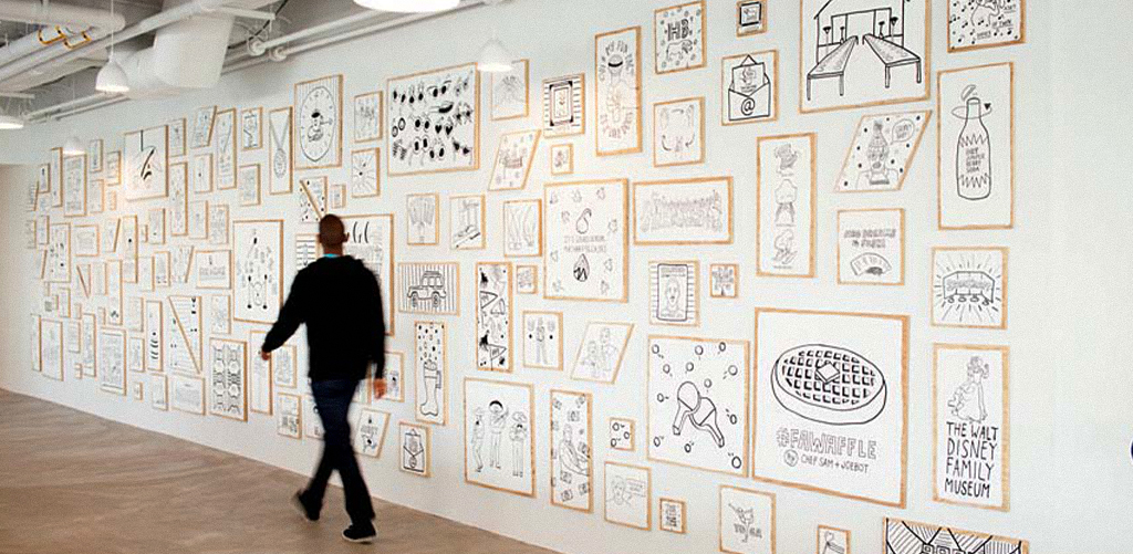 Example: Airbnb Offices (San Francisco) — They redesigned their spaces to resemble the homes listed on their platform. One of their early design fixes? Lowering all the artwork! Art floating near the ceiling looks disconnected and awkward.