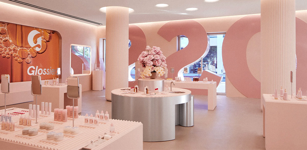 Example: Glossier Showrooms (LA & NYC) — Before mounting anything, their teams use cut-out templates to test different wall arrangements. It’s smart and saves walls from a million nail holes.