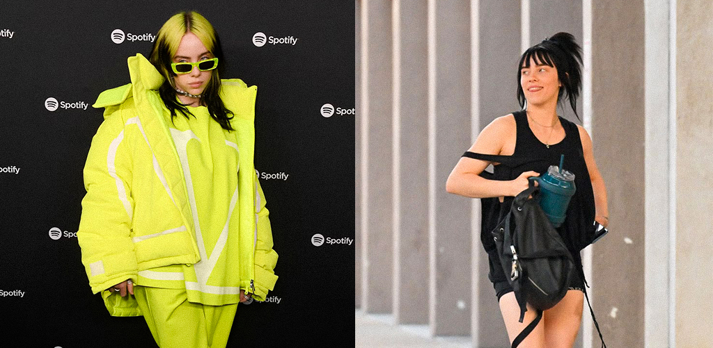 Billie Eilish going from baggy clothes to body-positive styles.