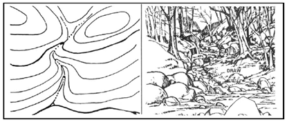 Draw: A draw is a less developed stream course than a valley. In a draw, there is essentially no level ground and, therefore, little or no maneuver room within its confines. If you are standing in a draw, the ground slopes upward in three directions and downward in the other direction. A draw could be considered as the initial formation of a valley. The contour lines depicting a draw are U-shaped or V-shaped, pointing toward high ground.