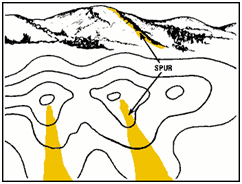 Spur: A spur is a short, continuous sloping line of higher ground, normally jutting out from the side of a ridge. A spur is often formed by two rough parallel streams, which cut draws down the side of a ridge. The ground sloped down in three directions and up in one direction. Contour lines on a map depict a spur with the U or V pointing away from high ground.