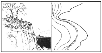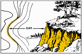 Cliff: A cliff is a vertical or near vertical feature; it is an abrupt change of the land. When a slope is so steep that the contour lines converge into one “carrying” contour of contours, this last contour line has tick marks pointing toward low ground. Cliffs are also shown by contour lines very close together and, in some instances, touching each other.