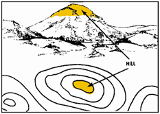 Hill: A hill is an area of high ground in round shape. If we look from a hilltop, the ground slopes down in all directions. A hill is shown on a map by contour lines forming concentric circles. The inside of the smallest closed circle is the hilltop.