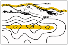Ridge: A ridge is a sloping line of high ground. If you are standing on the centerline of a ridge, you will normally have low ground in three directions and high ground in one direction with varying degrees of slope. If you cross a ridge at right angles, you will climb steeply to the crest and then descend steeply to the base. Contour lines forming a ridge tend to be U-shaped or V-shaped. The closed end of the contour line points away from high ground or pointing downhill. The term ridgeline is not interchangeable with the term ridge. A ridgeline is a line of high ground, usually with changes in elevation along its top and low ground on all sides of a land mass.