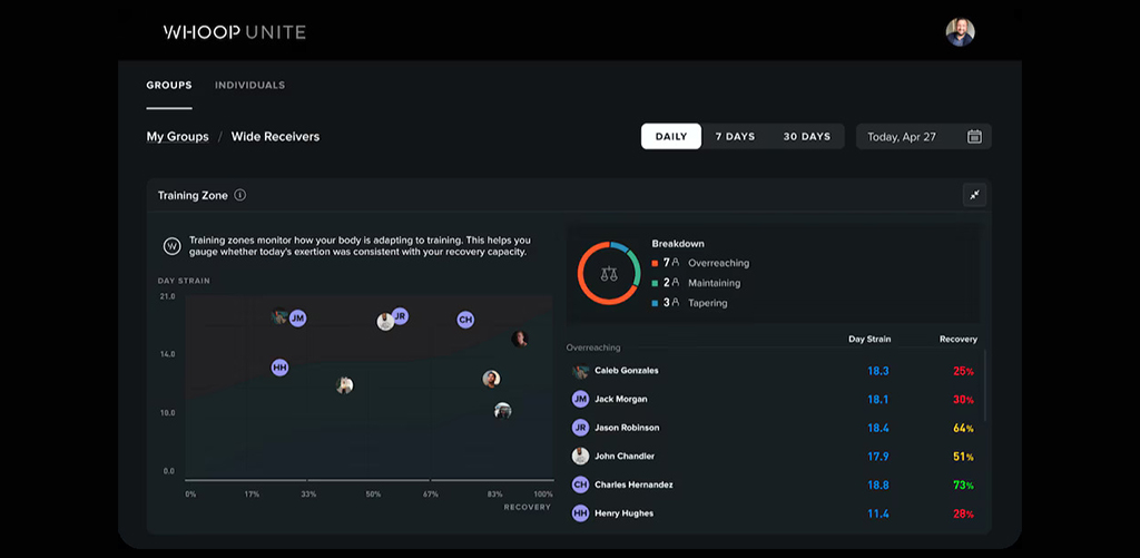 WHOOP is a fitness wearable that tracks recovery, sleep, and strain — but without a screen. The magic? All the data shows up in the app, through a UX/UI system that translates complex biometrics into easy-to-read dashboards.