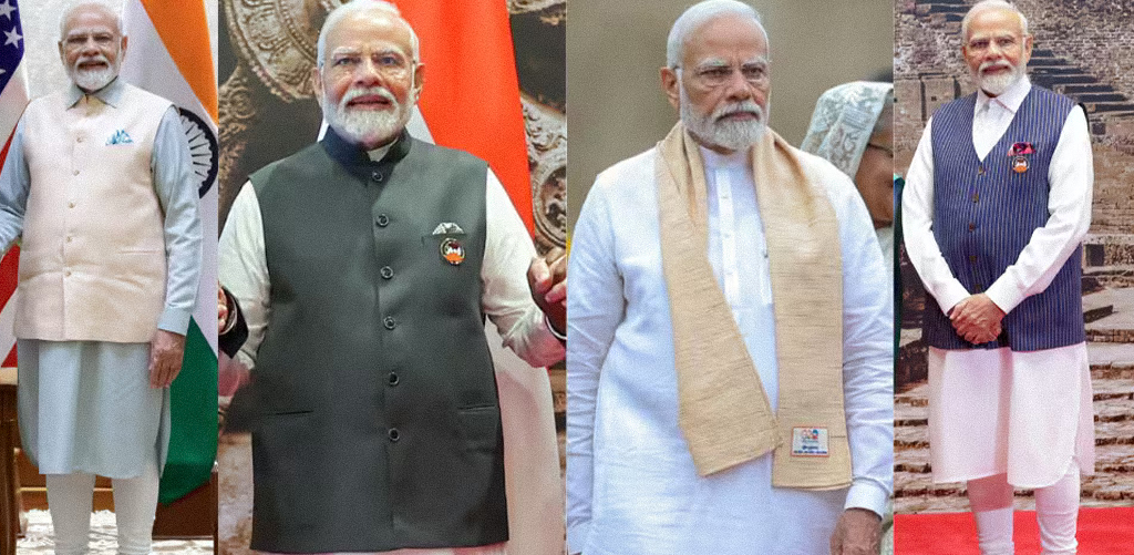 Modi’s outfits often include symbolic elements, like the time he wore a pinstripe suit with his name woven into the stripes. Every detail is calculated to show authority, tradition, and pride.